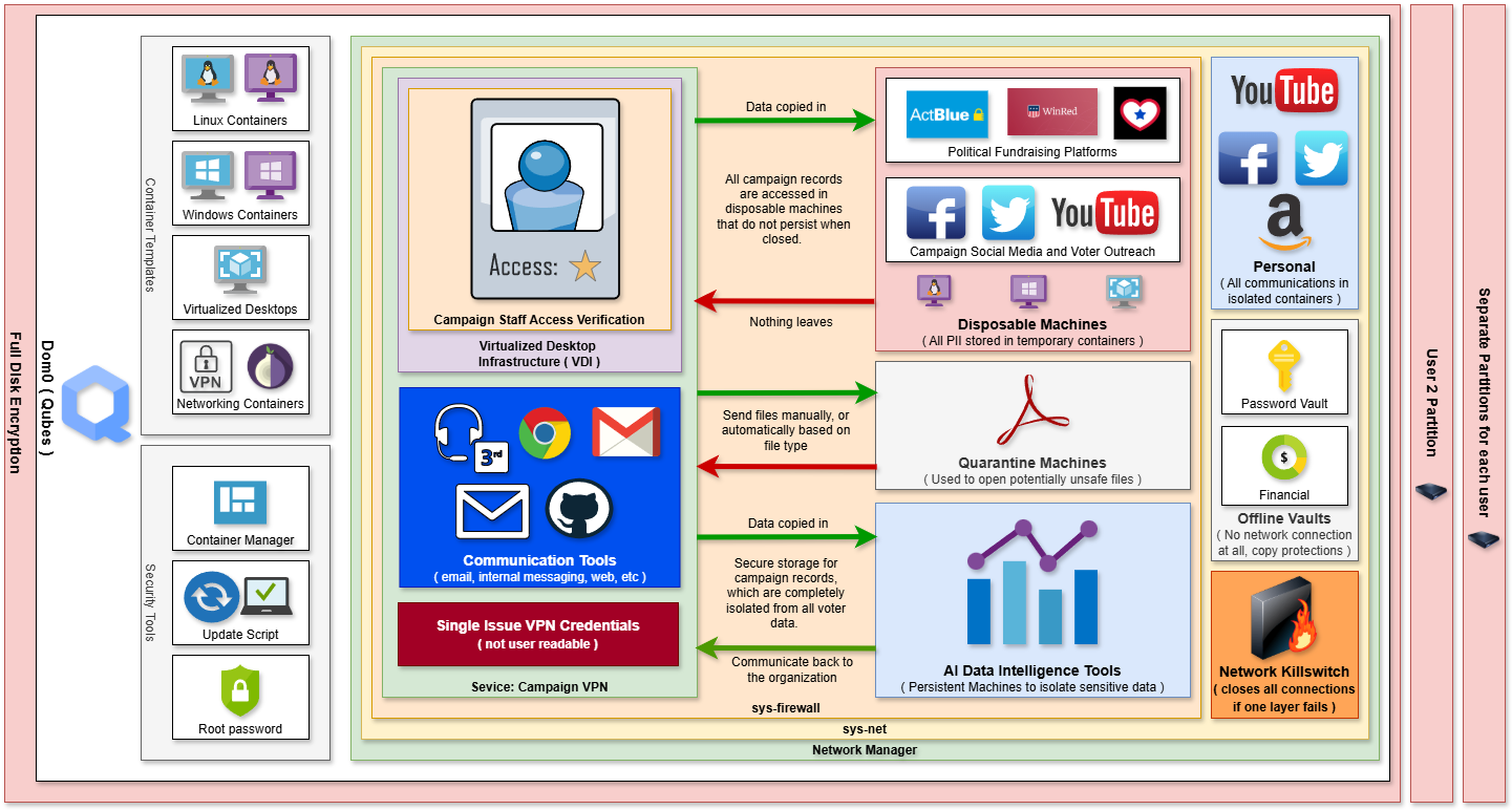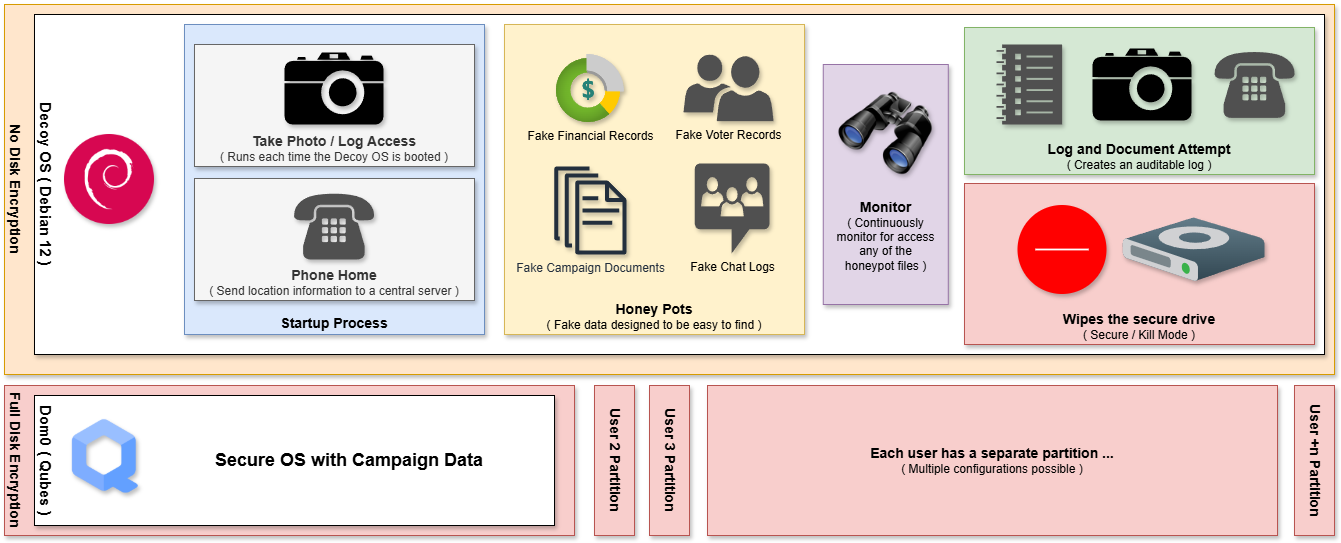 Upon startup, the laptop operates in a decoy OS mode, presenting a standard interface to deter unauthorized access, while the secure Qubes environment remains hidden for confidential work.